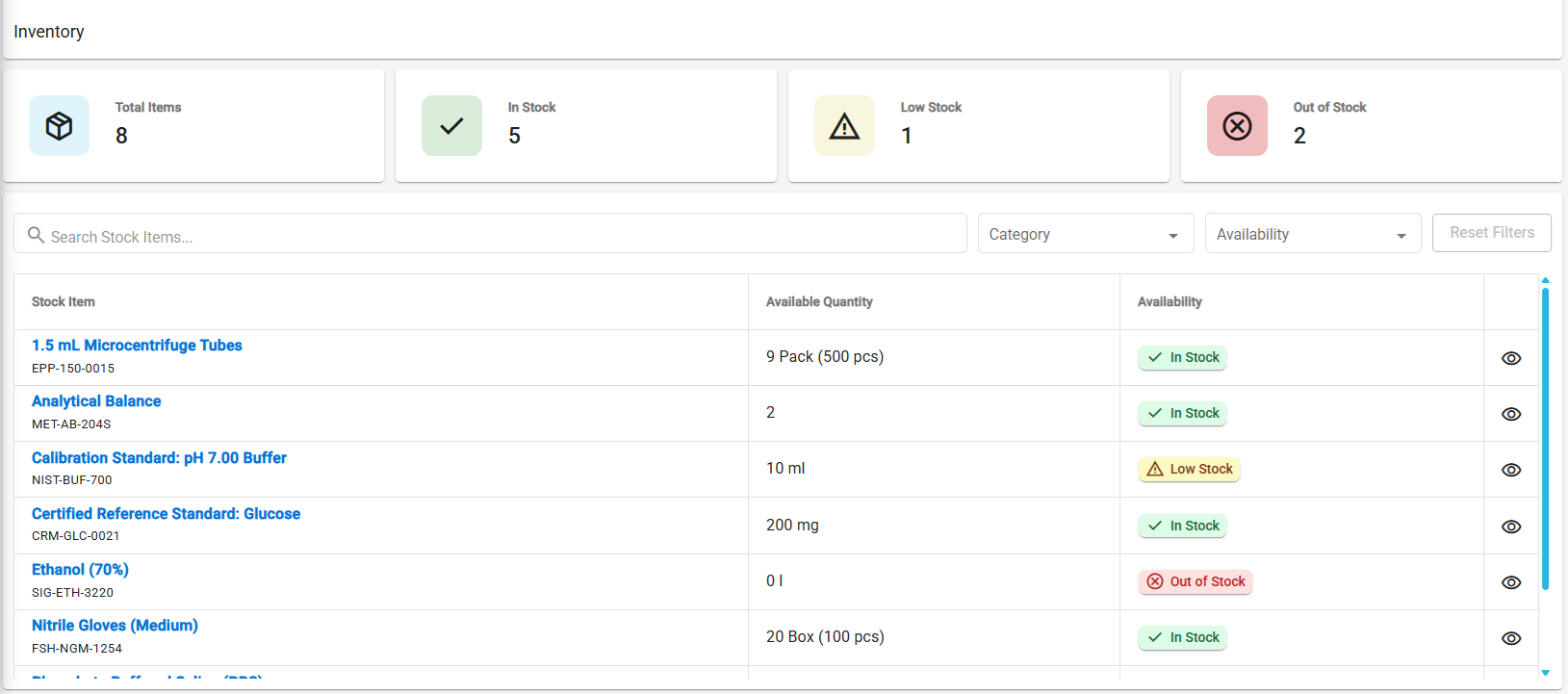 Stock Management in LabHQ provides a real-time inventory dashboard that brings all stock items into one central view.